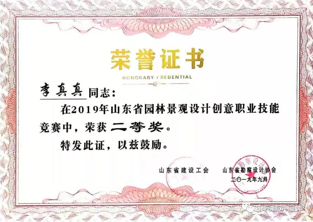 祝賀我公司李真真在2019年度山東省園林景觀設計創(chuàng)意職業(yè)技能競賽中獲得全省二等獎的驕人戰(zhàn)績。為公司和個人贏得榮譽。