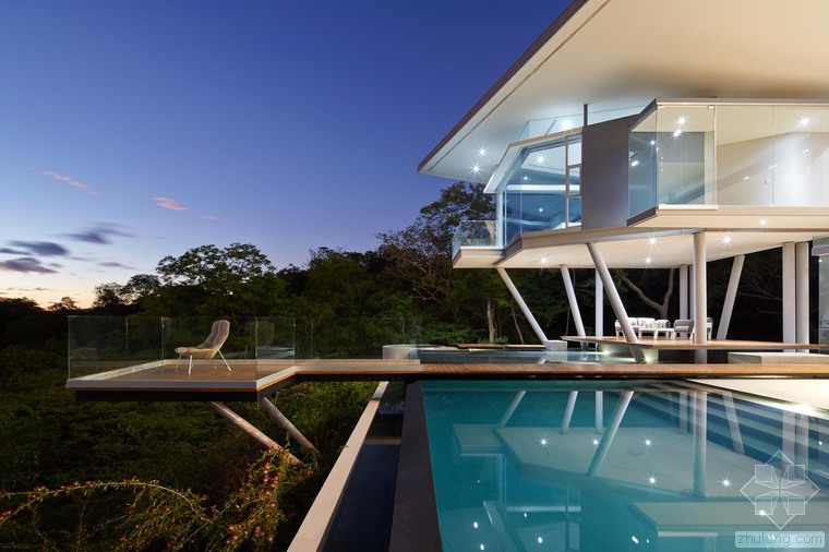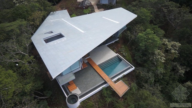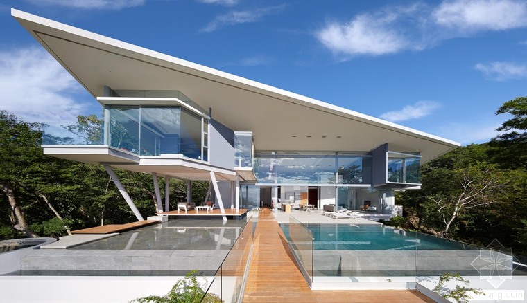 Indios Desnudos 別墅在加約半島,位處于朝海的一個(gè)尖端處,略向下傾斜的半島形山脊,兩邊有森林(其中一個(gè)是自然保護(hù)區(qū))。這個(gè)名字來自于場地里最有特點(diǎn)的一些樹:indio desnudo(赤裸的印第安人),它們組成了別墅的一個(gè)焦點(diǎn),特別在居住區(qū)。別墅的設(shè)計(jì)旨在讓人享受室外生活和視野。因此,它被設(shè)計(jì)成在沒有空調(diào)的條件下仍然能舒適生活的建筑。室內(nèi)空間與室外空間相整合,在室內(nèi)的同時(shí)感覺像在室外。所有的居住空間都有通向大?;蚴巧直Wo(hù)區(qū)的視野。它有其主要的通向大堂的通道,你可以通過它看到社交區(qū)和大海。從這里你可以使用像木棧道一樣的走道,懸在分散的河石上,組成了流線的兩條軸線,組成樓層平面圖,或者使用樓梯通過橋梁到達(dá)兩個(gè)主臥室。