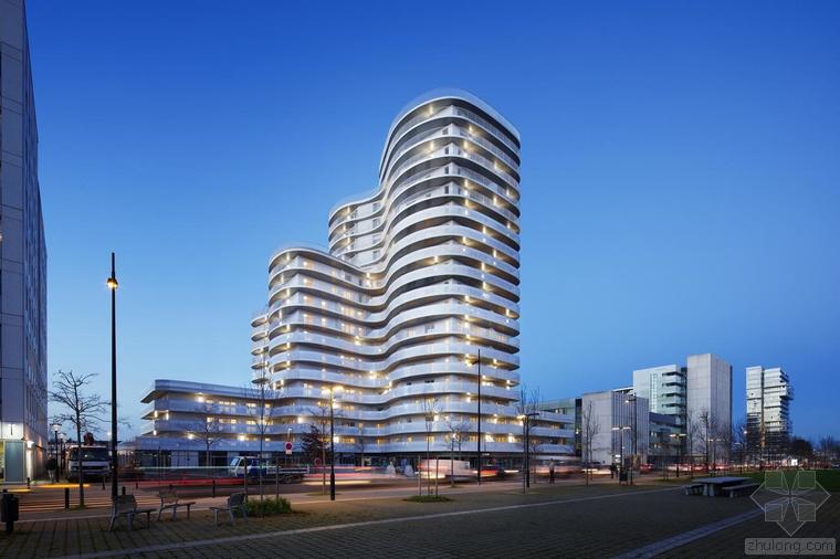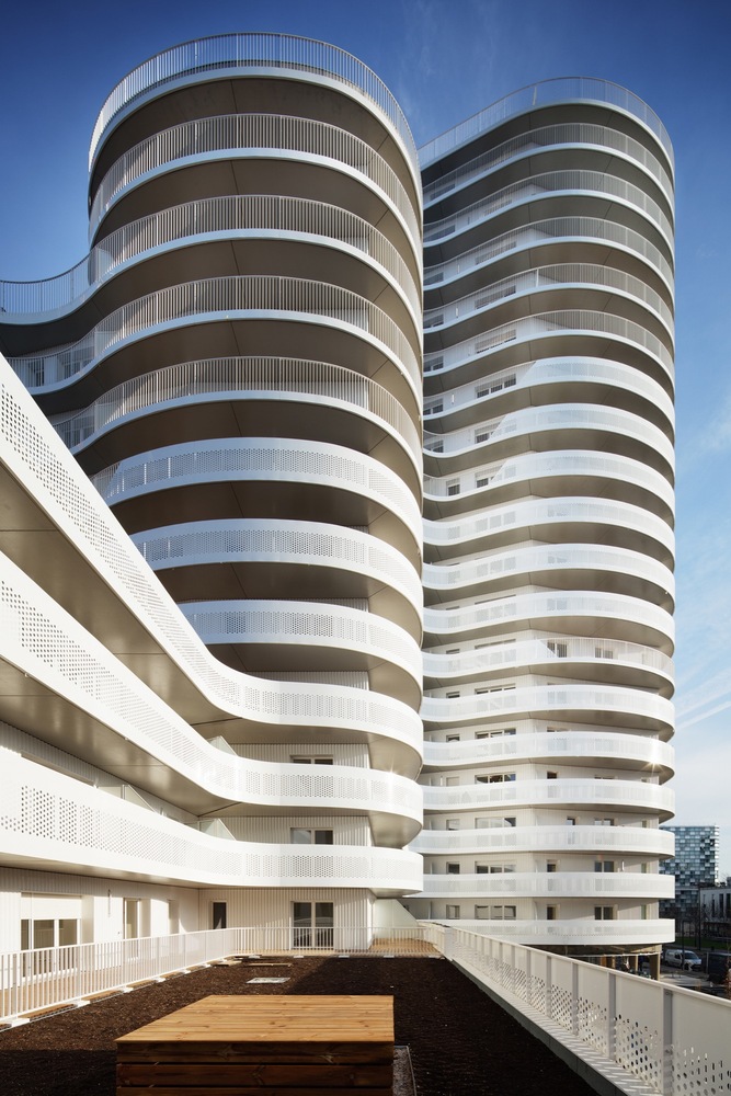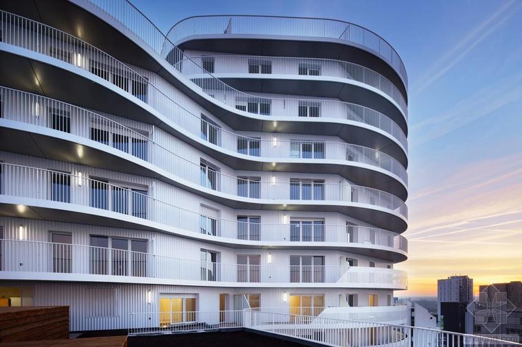 這是一棟建造于核心區(qū)位的獨特建筑。New’R大樓由流線型的折角和四周波浪起伏的陽臺構(gòu)成,這樣的造型設(shè)計不僅是在向奧斯卡•尼邁耶致敬,還是在向上世紀七十年代法國里維埃拉的建筑(例如由André Minangoy 和 Michel Marot設(shè)計的天使灣碼頭)致敬,最后還暗示了快樂主義者對邁阿密海灘的幻想。這座建筑顯得感性而又賦有多向性,其所在位置在“畢加索郵路”和目前沿鐵路基礎(chǔ)設(shè)施設(shè)置的、尚處于開發(fā)階段的新住區(qū)之間的重要節(jié)點上。New’R大樓對現(xiàn)有場地的構(gòu)建體現(xiàn)在對基地形成的環(huán)擁之勢和對新景觀的塑造。