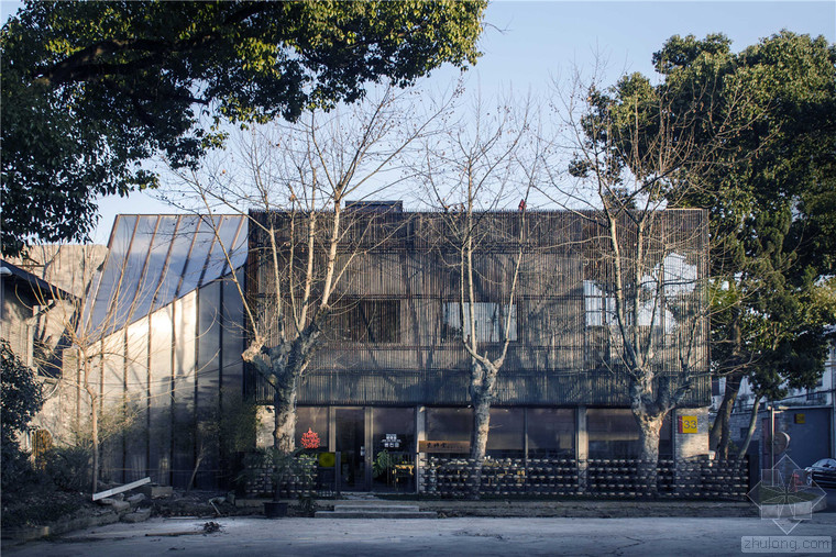 瓷語(yǔ)堂項(xiàng)目是對(duì)建筑原真性的一次回歸,我們希望通過(guò)一個(gè)最簡(jiǎn)單的手段介入場(chǎng)地,使得建筑物僅僅作為一個(gè)“存在”與基地發(fā)生關(guān)系,而不是通過(guò)美學(xué)加以評(píng)判。在面對(duì)場(chǎng)地現(xiàn)狀已經(jīng)存在的幾棟老建筑和一棵大樹(shù),我們希望它們可以成為場(chǎng)地記憶的再現(xiàn),作為新建筑的一部分共同留存下去,而不是簡(jiǎn)單的粗暴拆除并由一個(gè)全新的物體所替代。通過(guò)合理的結(jié)構(gòu)布置和構(gòu)造處理,新房子輕巧的微微落于老墻之上,二者完整的融合在了一起,斑駁的老墻和由磚、木等樸素材料構(gòu)筑的新建筑自然而然的和諧共生,而老墻的歲月留下的痕跡亦為建筑提供了不可復(fù)制的特征。場(chǎng)地上的大樹(shù)成為了我們南側(cè)的重要遮蔽,使得二層的露臺(tái)不會(huì)直接暴露在正對(duì)的一條小路前面,同時(shí)也為露臺(tái)貢獻(xiàn)了不同季節(jié)的多樣風(fēng)景和光影特質(zhì)。作為陶瓷藝術(shù)家展示、交流和工作的場(chǎng)所,空間的布置簡(jiǎn)潔而不失特點(diǎn),混凝土、青磚等樸素而帶有一點(diǎn)點(diǎn)粗糙質(zhì)感的材料與陶瓷藝術(shù)品相映成趣,建筑低調(diào)地成為了作品的背景。