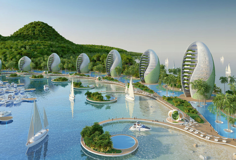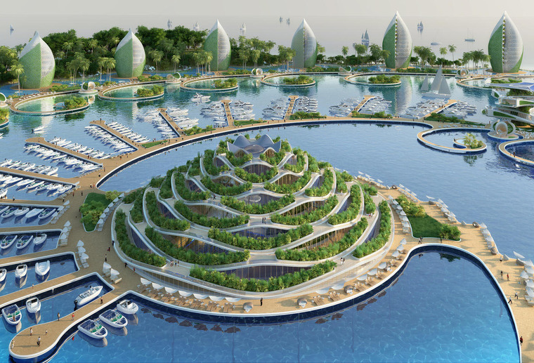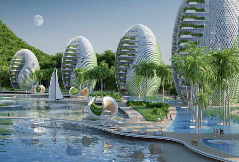 度假村廣泛使用“從源頭到源頭”的再利用方略和其他可持續(xù)設(shè)計(jì)策略,將本次方案設(shè)計(jì)成一系列螺旋形式的公寓樓和貝殼狀的旅館建筑,并將這些建筑按照兩條斐波納契螺線的旋轉(zhuǎn)軌跡排布于沿海環(huán)礁湖的岸邊。建筑群的中心是一座山形的綜合體,里面設(shè)置有學(xué)校、休閑游泳池、體育大廳、供度假村使用的廚房以及供環(huán)境科學(xué)家使用的整套實(shí)驗(yàn)室用房。本次方案起名為“鸚鵡螺生態(tài)度假村”,生態(tài)設(shè)計(jì)是本次項(xiàng)目的主要側(cè)重點(diǎn),Vincent Callebaut事務(wù)所精準(zhǔn)地指出對(duì)菲律賓群島構(gòu)成的環(huán)境威脅并以此作為設(shè)計(jì)靈感。方案中運(yùn)用了各種各樣的可再生能源,包括潮汐能與太陽能,如果這些自產(chǎn)的能源在使用后還有結(jié)余,便會(huì)連接到地方電網(wǎng)并提供給社區(qū)。